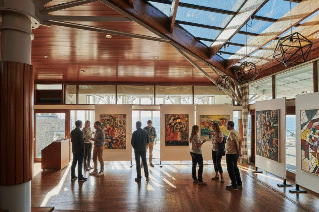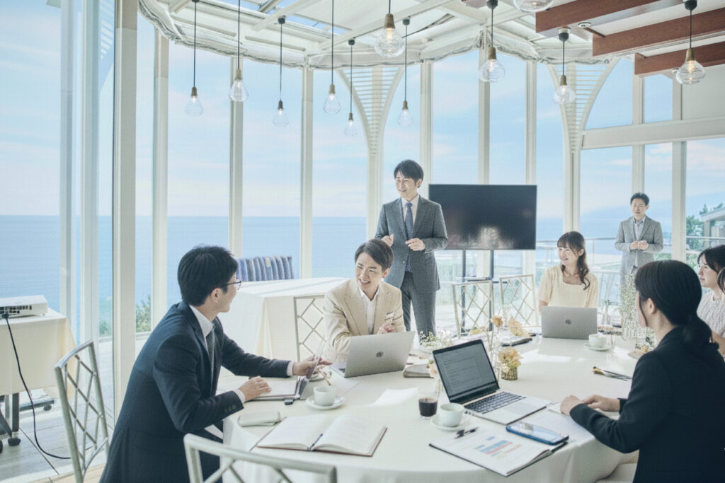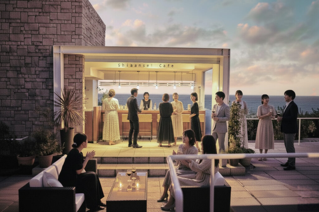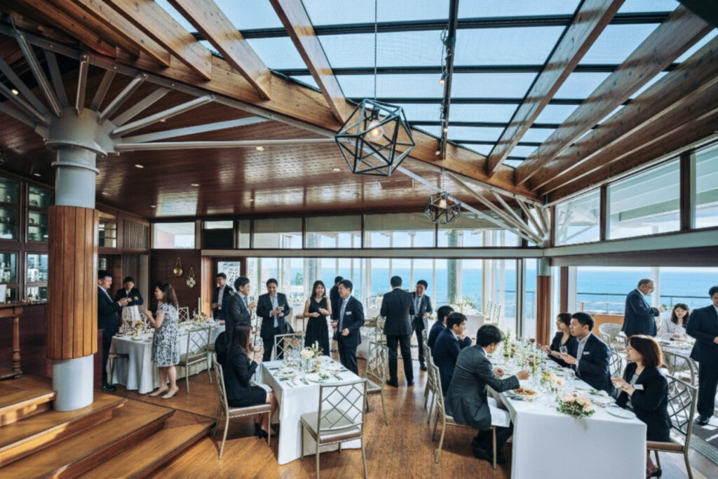 JR二宮駅から徒歩10分。海を180度見渡せる指帆亭で、各種宴会・イベント・展示会が叶います。開放感ある会場で、思い思いの時間をお過ごしください