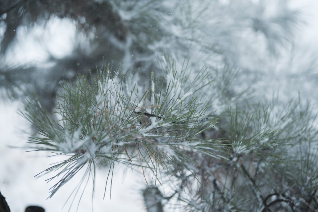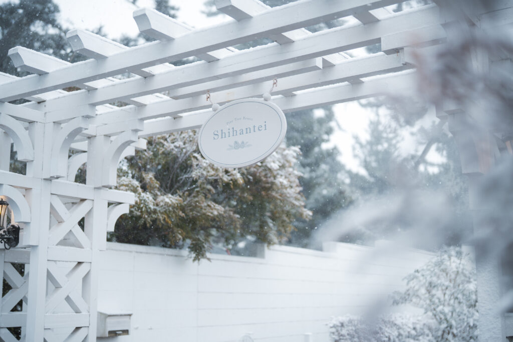 松の木や屋根に雪が積もり、真っ白ないつもと違う特別な指帆亭の景色。