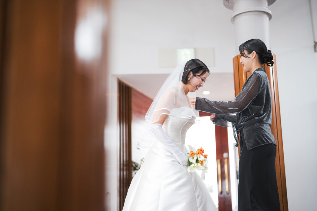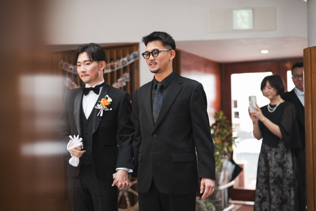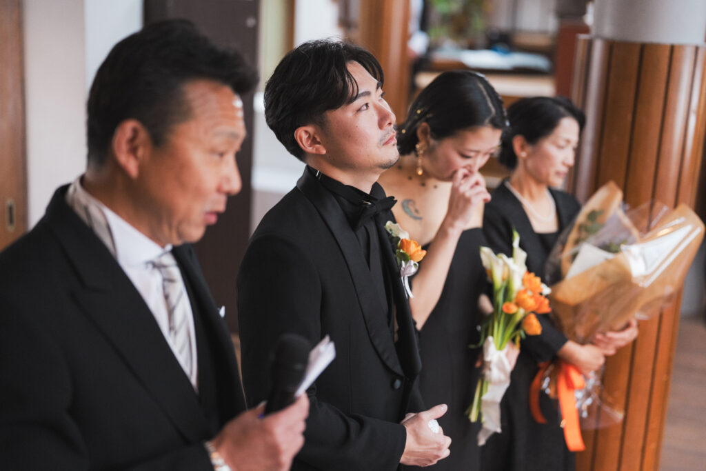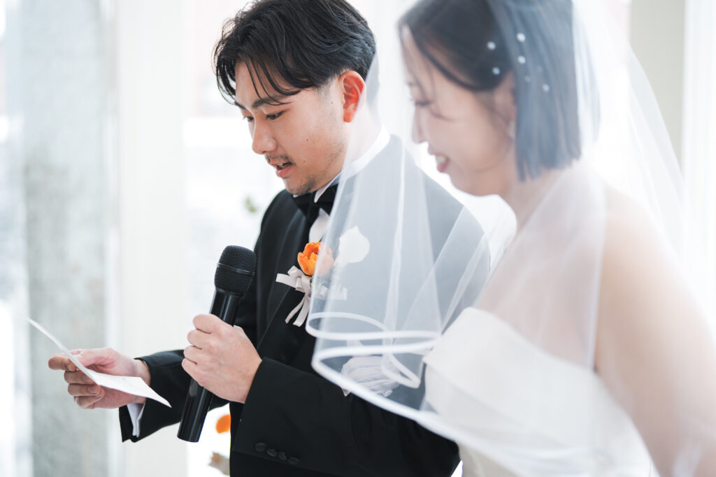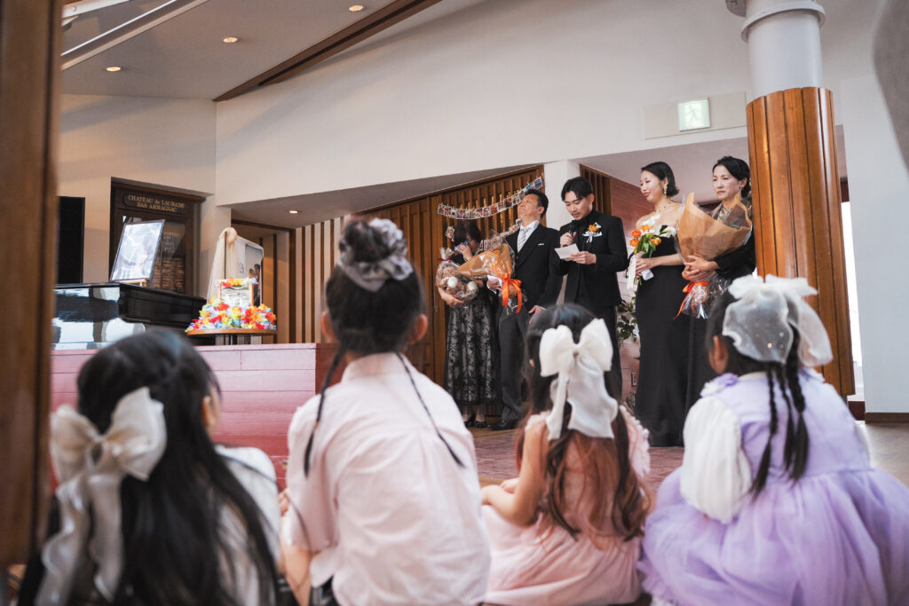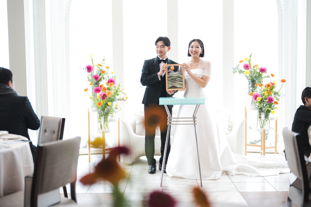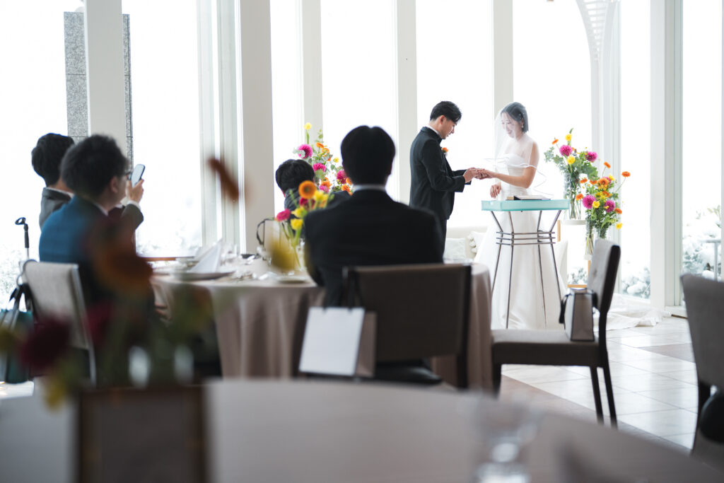 おふたりが選ばれたのは会場内での人前式。大切なゲストのみなさまに、おふたりの誓いを見守っていただく、温かなセレモニーです。