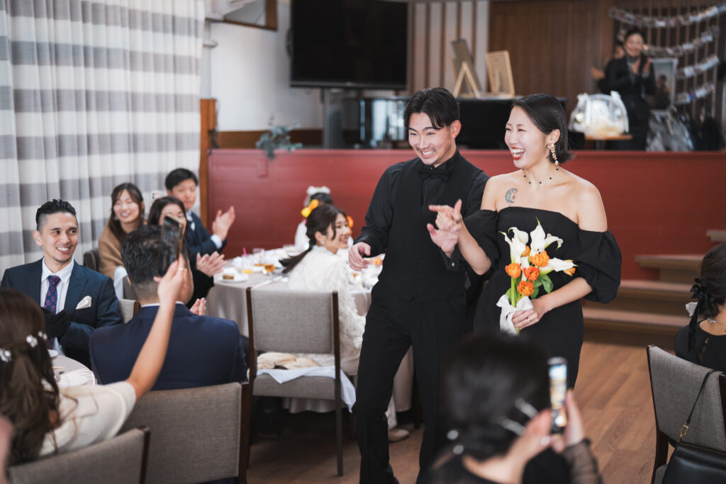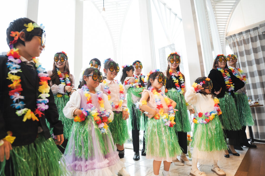おふたりのブラックコーデに、フラの華やかな色合いがマッチ。とても可愛らしく華やかなダンスをご披露いただきました。